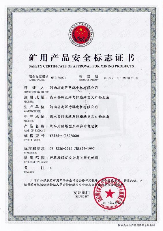 YBJ煤礦井下絞車用隔爆型三相異步電動(dòng)機(jī)防爆合格證