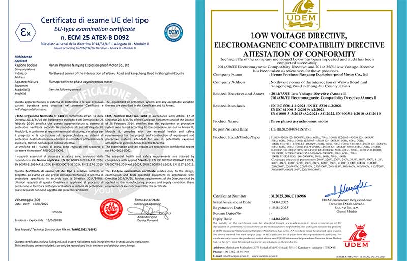 近日,河南省南洋防爆電機(jī)有限公司傳來(lái)喜訊:公司自主研發(fā)生產(chǎn)的防爆電機(jī)產(chǎn)品,順利通過(guò)權(quán)威機(jī)構(gòu)的嚴(yán)格檢測(cè)與審核,正式獲得CE認(rèn)證證書(shū)與ECM 25 ATEX-B D092證書(shū)。這兩項(xiàng)國(guó)際權(quán)威認(rèn)證的取得,不僅標(biāo)志著南洋防爆電機(jī)的產(chǎn)品質(zhì)量、安全性能達(dá)到了國(guó)際標(biāo)準(zhǔn),也為企業(yè)進(jìn)一步拓展海外市場(chǎng)奠定了堅(jiān)實(shí)基礎(chǔ)。